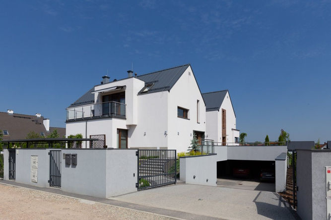Prezentowana realizacja obejmuje dwa budynki mieszkalne jednorodzinne w zabudowie bliźniaczej, zaprojektowane i zrealizowane dla dwóch różnych Klientów. Obiekty tworzą spójną, harmonijną całość pod względem architektonicznym i estetycznym, wpisując się w założenia wspólnej kompozycji przestrzennej.